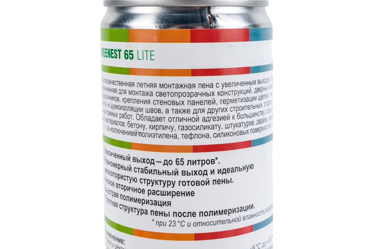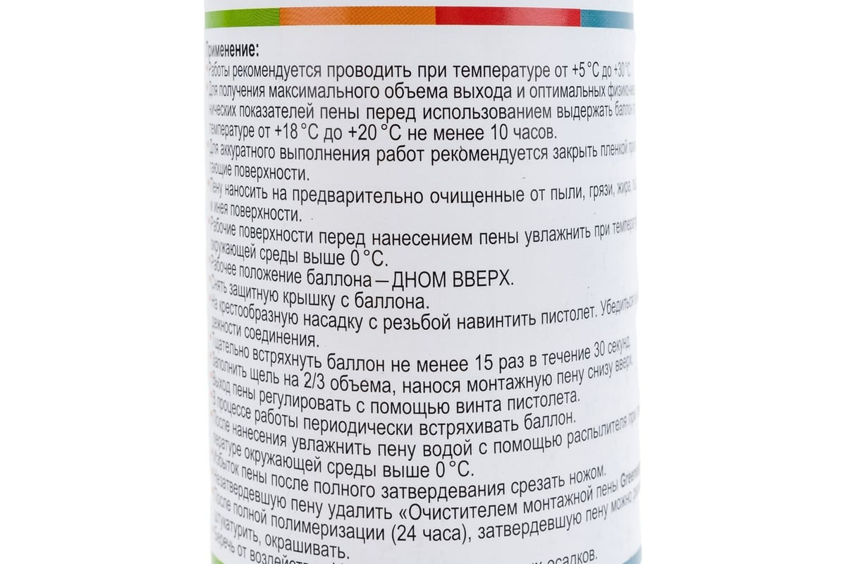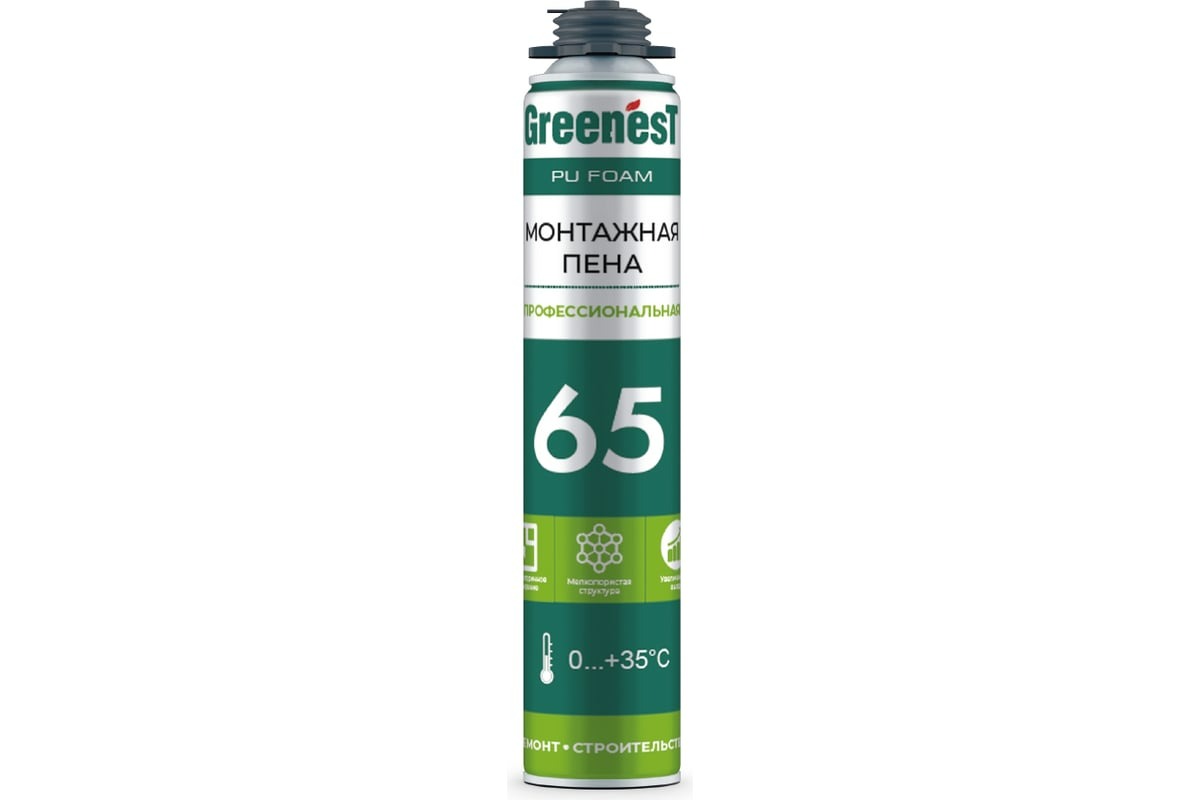 Высококачественная полиуретановая монтажная пена GreenesT обеспечивает равномерный, стабильный выход и идеальную мелкопористую структуру, обладает высокой адгезией к большинству строительных материалов, таких как: бетон, кирпич, штукатурка, дерево, пластик, за исключением полиэтилена, полипропилена и фторопласта.